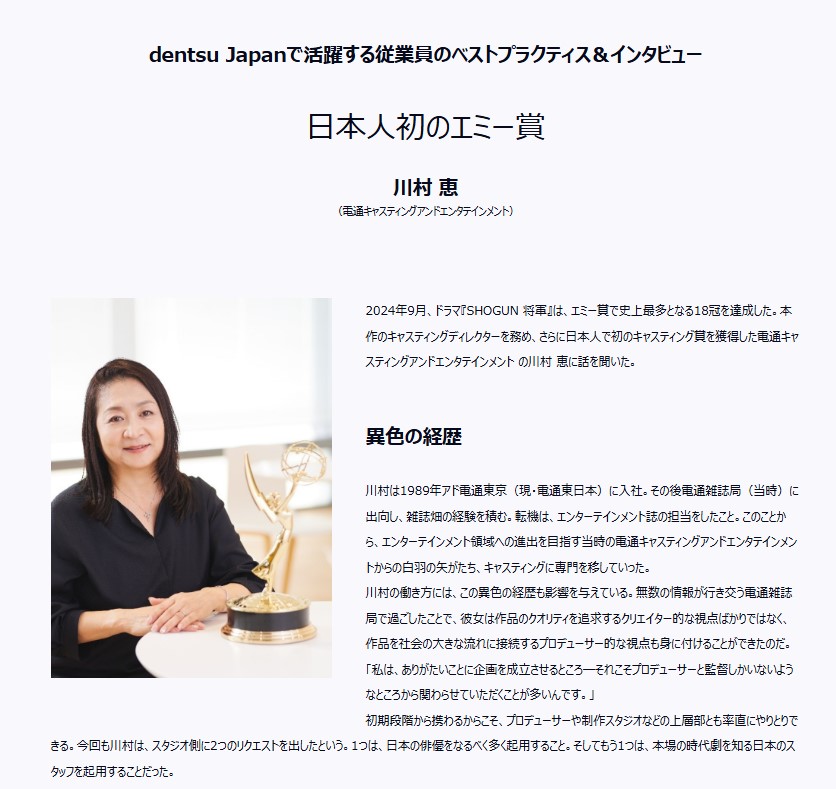 dentsu Japanウェブサイト内「dentsu Japanで活躍する従業員のベストプラクティス&インタビュー」にて、川村恵のインタビュー「日本人初のエミー賞」が掲載されました。